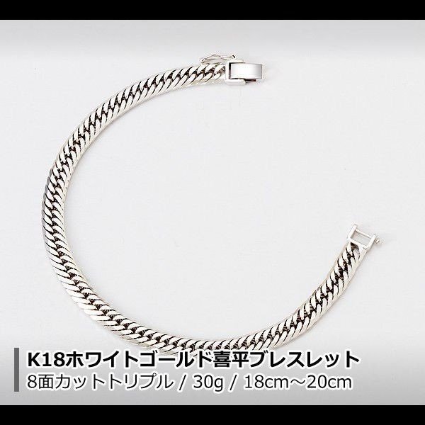 18金 ホワイトゴールド 喜平 ブレスレット K18WG 8面カットトリプル 30g 18cm 20cm 造幣局検定マーク 刻印入り メンズ レディース キヘイ チェーン