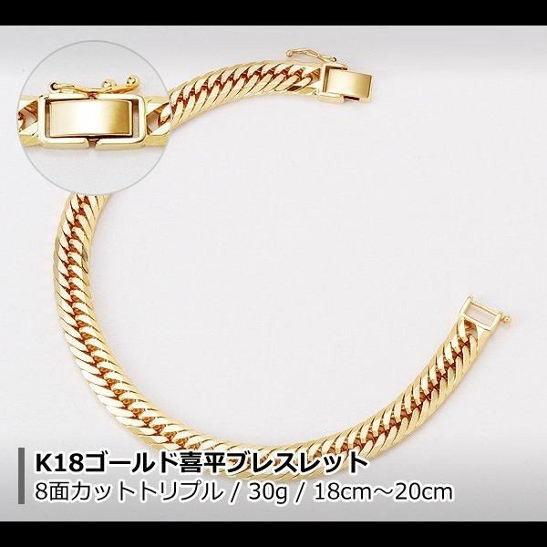 18金 喜平 ブレスレット K18 8面カットトリプル 30g 18cm 20cm 造幣局検定マーク 刻印入り メンズ レディース キヘイ チェーン